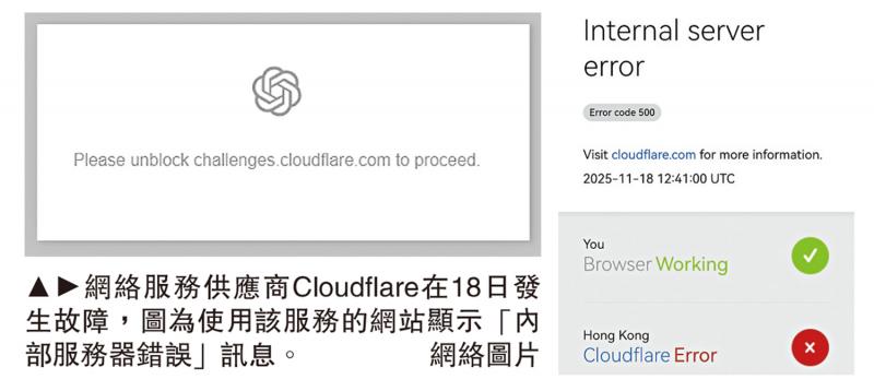 图:网络服务供应商Cloudflare在18日发生故障,图为使用该服务的网站显示“内部服务器错误”讯息。\网络图片