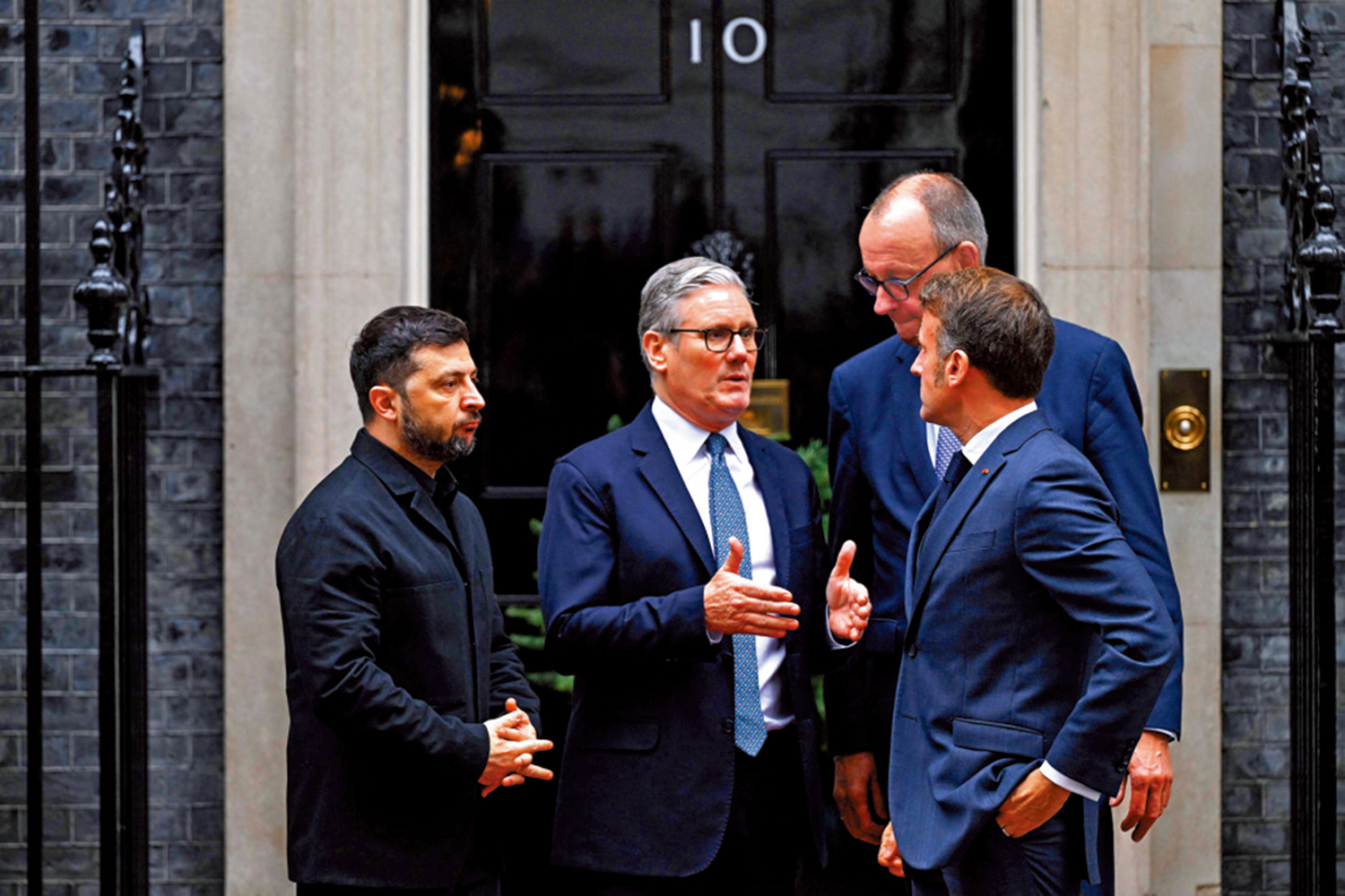 图:泽连斯基(左一)8日与英法德领导人会面,寻求欧洲支持。\法新社