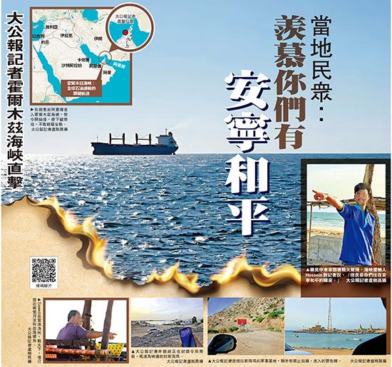 大公报记者抵达阿联酋最北端的拉斯海玛,昨晚在霍尔木兹海峡的岸边,直击美国海军封锁霍尔木兹海峡一刻,由禁令开始后的40分钟,远处海边传来第一轮震耳欲聋的炮声。当地民众表示,战争为平民带来灾难,批评美国将炮火带到中东,羡慕中国内地和香港特区安定繁荣,期望中东早日恢复和平。