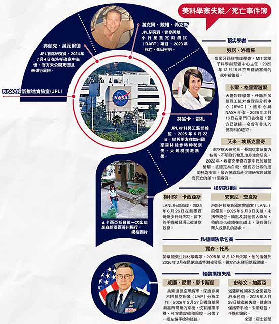 值得注意的是,部分受害者出现与麦卡斯兰雷同且反常的失踪行为。去年6月,美国太空总署(NASA)喷气推进实验室(JPL)材料与工艺部总监雷扎与朋友徒步时神秘失踪。据她同伴称,她们相距约9米,曾看到雷扎微笑挥手,但再回头时她已消失无踪。调查人员至今仍未找到任何关于她的踪迹。雷扎参与的研究曾受空军资助,而负责监督该领域的正是麦卡斯兰。