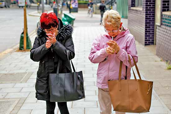 图:英国将实施更严格的禁烟法律。图为两名女子在伦敦街头吸烟。\路透社