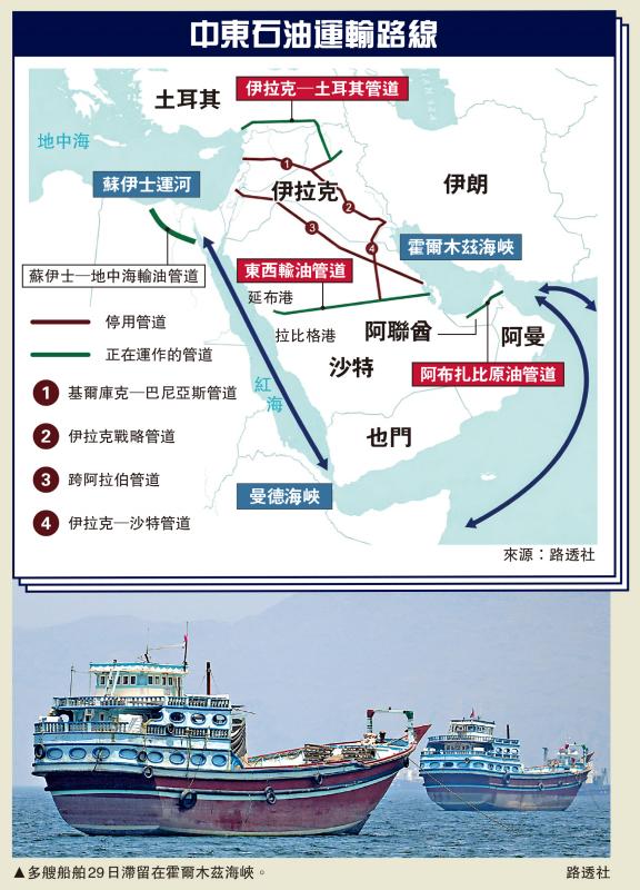 沙特和阿联酋通过陆路输油管道,将石油分别输送至红海港口和阿曼湾港口,从而避开霍尔木兹海峡。