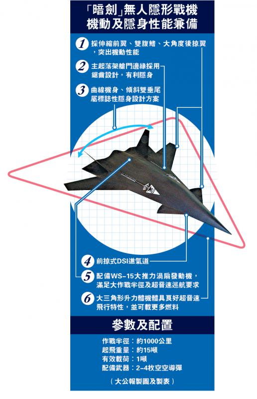 报道认为,“暗剑”的外形设计与中国现役隐形战机歼-20非常相似,性能指标可能与中国第五代战机相当,起飞重量约15吨,有效载荷为1吨,作战半径约1000公里。如果用于空对空作战,“暗剑”可能会对西方有人驾驶战机─比如F-22构成性能优势。