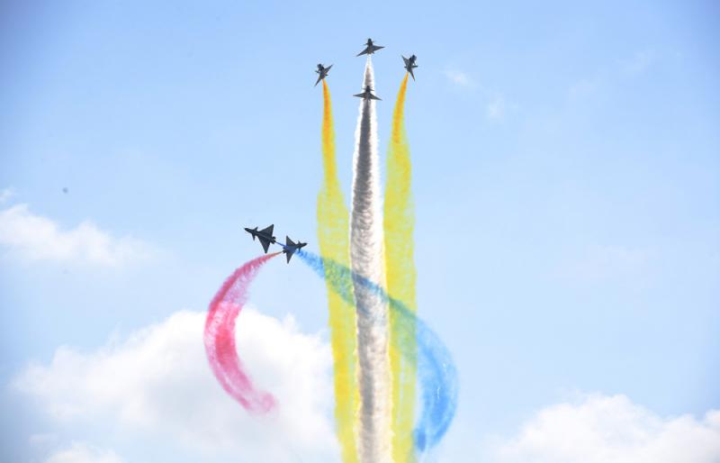 图:八一飞行表演队在珠海航展中作空中展示\中新社