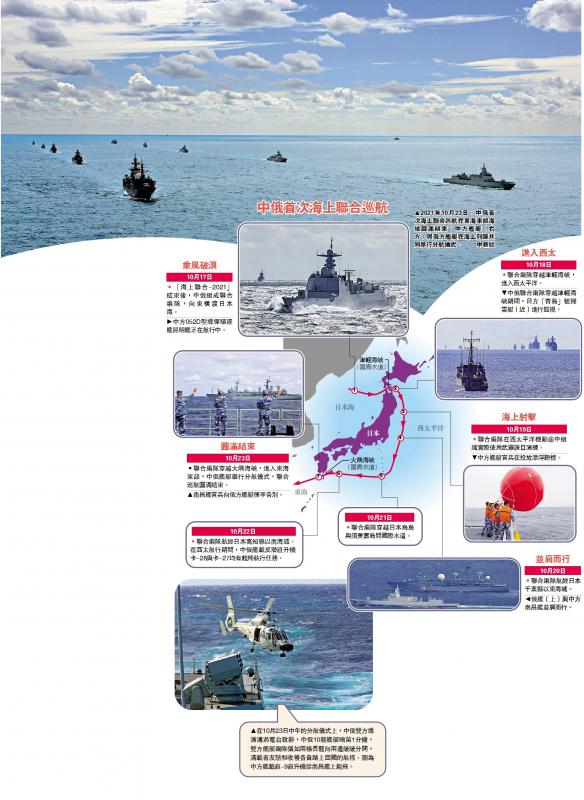 中俄“海上联合-2021”军事演习10月14日至17日在俄罗斯彼得大帝湾附近海空域举行。演习结束后,双方组成联合编队,自17日至23日开展首次海上联合巡航。