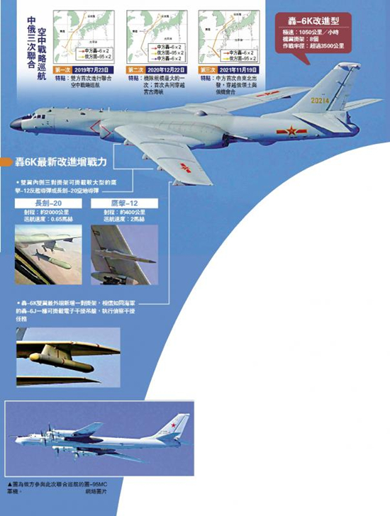 在日前中俄空军联合巡航中,中方派出2架轰-6K飞机,与俄方2架图-95MC飞机联合编队。中国空军的轰-6K“战神”轰炸机首次展现了8个挂架的新型号。与以往6挂架的传统配置相比,8挂架令轰-6K有了更强的挂载能力,不仅可加强远程打击火力,更可通过挂载电子吊舱,增强电子战能力,更好地遂行对陆攻击和对海反舰任务。