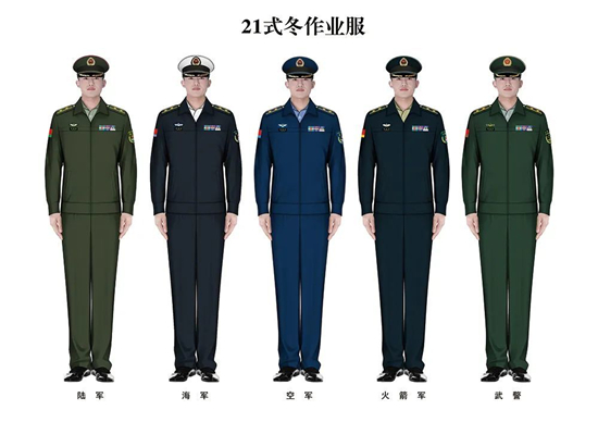 21式作训服和作业服是构建具有我军特色新时代军服体系的重要组成部分。21式作训服主要包括迷彩作训服、特勤作训服和作战靴,用于作战、训练、战备、执勤、遂行非战争军事行动任务时穿着。迷彩作训服区分丛林、荒漠等颜色;特勤作训服包括舰艇、空勤和地勤作训服,满足特殊岗位人员需要;作战靴(鞋)区分通用和专用。21式作业服是我军军服调整优化的新系列,采用夹克款式设计,区分春秋、冬作业服,运用新的军种颜色,配套大(卷)檐帽、作业服皮鞋等品种,用于办公等一般性日常活动时穿着。