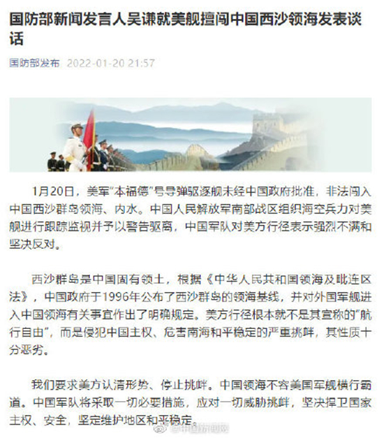 据国防部发布:1月20日,美军“本福德”号导弹驱逐舰未经中国政府批准,非法闯入中国西沙群岛领海、内水。中国人民解放军南部战区组织海空兵力对美舰进行跟踪监视并予以警告驱离,中国军队对美方行径表示强烈不满和坚决反对。