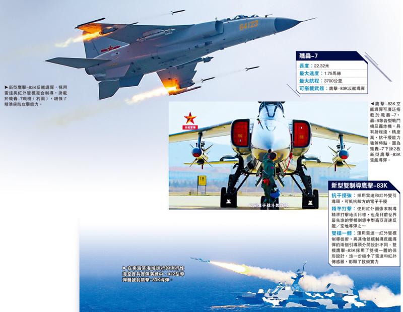 图:新型鹰击-83K反舰导弹,采用雷达与红外双模复合制导,挂载于歼轰-7战机(右图),增强了精准突防攻击能力。