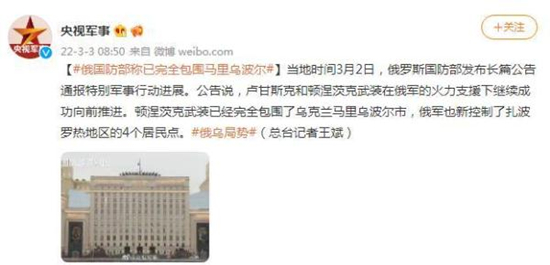 当地时间3月2日,俄罗斯国防部发布长篇公告通报特别军事行动进展。公告说,卢甘斯克和顿涅茨克武装在俄军的火力支援下继续成功向前推进。顿涅茨克武装已经完全包围了乌克兰马里乌波尔市,俄军也新控制了扎波罗热地区的4个居民点。