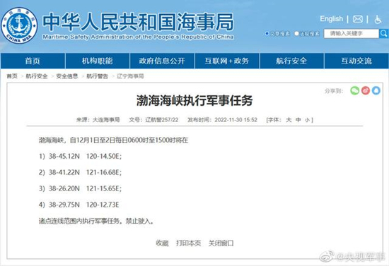 据中国海事局网站消息,大连海事局发布航行警告,自12月1日至2日每日6时至15时,渤海海峡执行军事任务,禁止驶入。