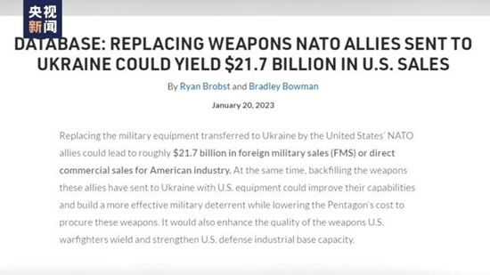 据美国智库“保卫民主基金会”20日发布的一份报告,西方多国因向乌克兰交付武器装备导致库存亏空,美国的北约盟友可能采购价值超过217亿美元的军火补充。报告中指出,这一数字既包括可能通过美国对外军售计划出口的部分,也包括美军工企业可能通过直接商业销售出口的部分。