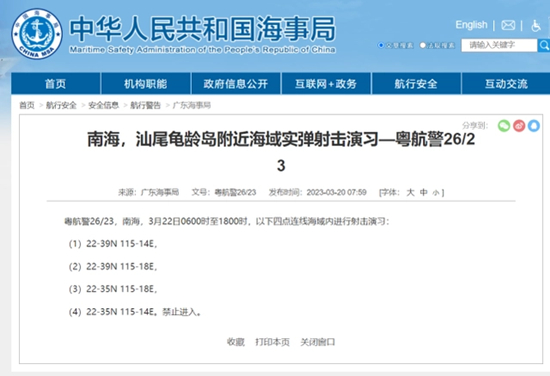 据中国海事局网站消息,广东海事局发布航行警告,3月22日6时至18时,南海汕尾龟龄岛附近海域实弹射击演习,禁止进入。