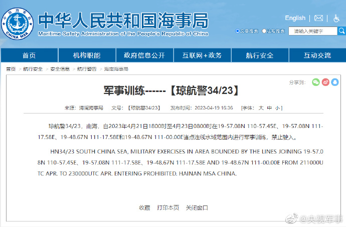 据中国海事局网站消息,清澜海事局发布航行警告,自4月21日18时至4月23日8时,南海部分海域进行军事训练,禁止驶入。