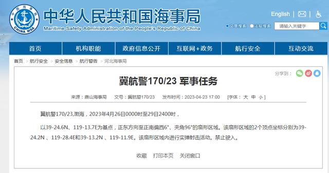 据中国海事局网站4月23日消息,河北海事局发布航行警告:4月26日0时至24时,渤海部分海域进行实弹射击活动,禁止驶入。
