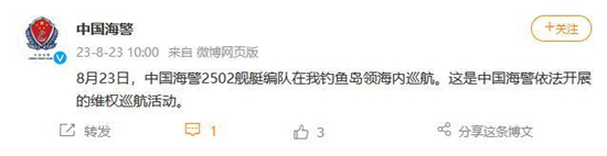 据中国海警局官方微博消息,8月23日,中国海警2502舰艇编队在中国钓鱼岛领海内巡航。这是中国海警依法开展的维权巡航活动。