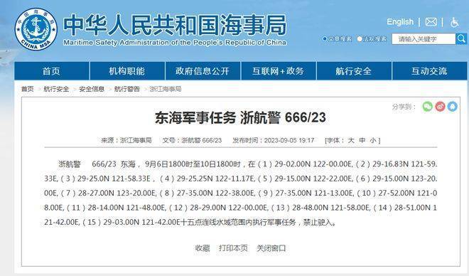 据中国海事局网站消息,浙江海事局发布航行警告,9月6日18时至10日18时,东海部分海域执行军事任务,禁止驶入。