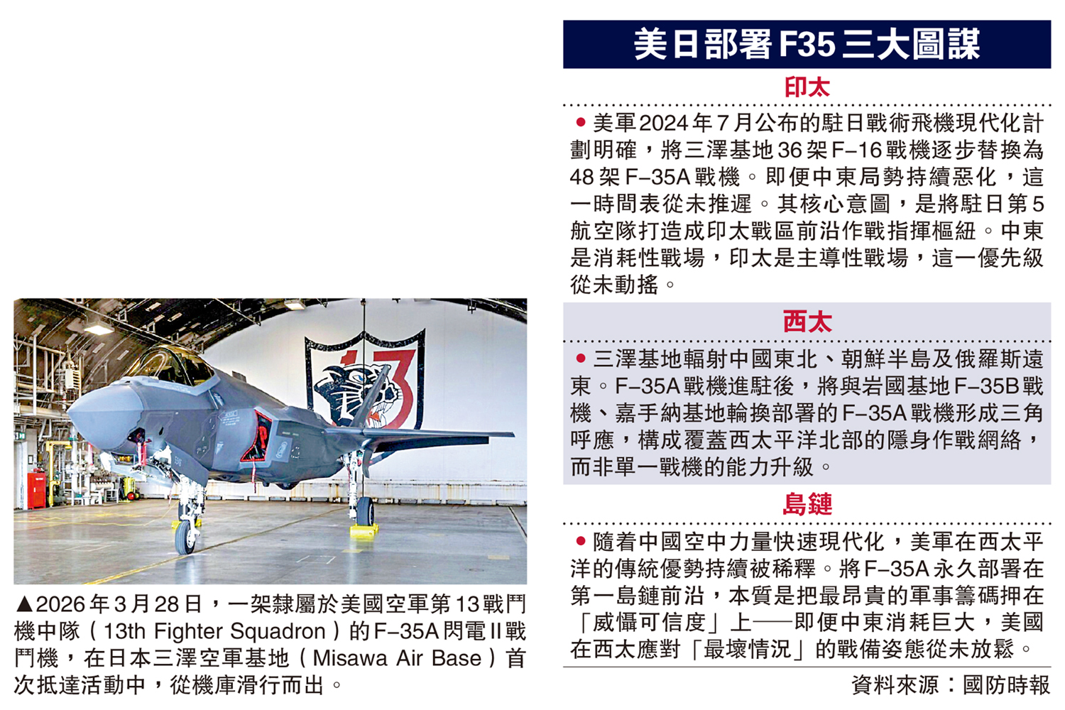 图:2026年3月28日,一架隶属于美国空军第13战斗机中队(13th Fighter Squadron)的F-35A闪电II战斗机,在日本三泽空军基地(Misawa Air Base)首次抵达活动中,从机库滑行而出。