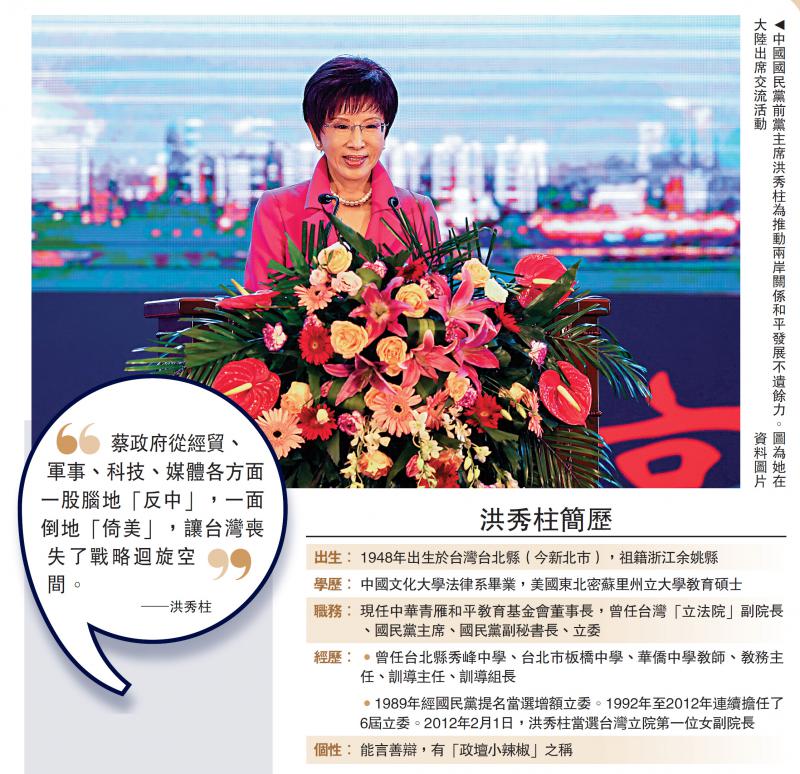 图:中国国民党前党主席洪秀柱为推动两岸关系和平发展不遗余力。图为她在大陆出席交流活动\资料图片