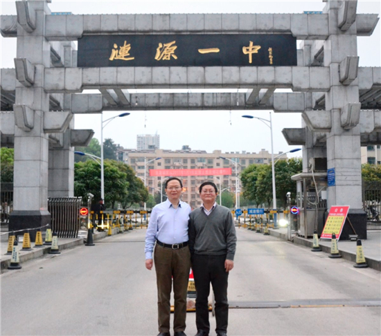 2016年,卢光明(左)与其同为涟源一中高中毕业的三弟卢黎明回母校参观。 受访者供图