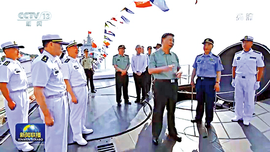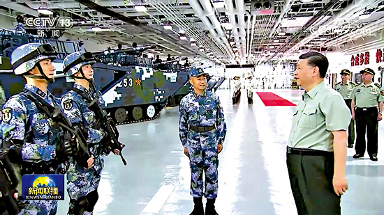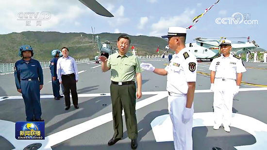 而军委主席同时为三艘大型主战舰艇授旗,在海军历史更是第一次。这最直接凸显最高统帅对建设强大海军的高度重视,体现了海军武器装备水平的提升、作战体系的完善、综合战力的飞跃。三种舰艇位于海军作战体系的最顶层,与航空母舰可以并称为“四大金刚”。譬如4万吨级的075型两栖攻击舰海南舰,是继两艘航母辽宁舰、山东舰之后,第三艘以省份命名的军舰,无愧“直升机航母”之称。随着两栖攻击舰的入列,加上航母、万吨驱逐舰、战略核潜艇数量的递增,海军作战力量一方面补足短板,一方面拉长长板,显示了齐头并进、迅猛发展的态势。