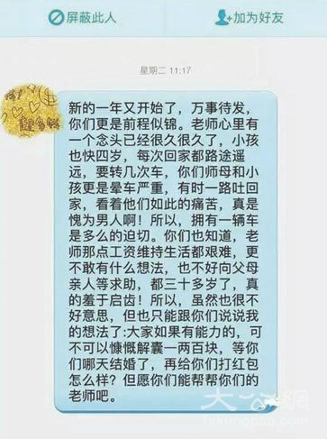 中国教师的整体收入水平低,生活困难是客观事实。我们当然不希望做老师的生活就如“清汤挂面”一般,但是在师生关系不对等的当下,做老师的应该知道如何避嫌,尤其涉及到金钱关系时,要“爱惜自己的羽毛”。这样不论是对自己还是对学生而言,都是一种责任的担当。不然,一有困难,教师们就如这般“哭穷”、“众筹”,把学生当做是钱袋子使,那最后中国的教育事业岂不是乱了套了?以后老师还怎么在课堂上教学生“以身作则”、“严于律己”这些道理。