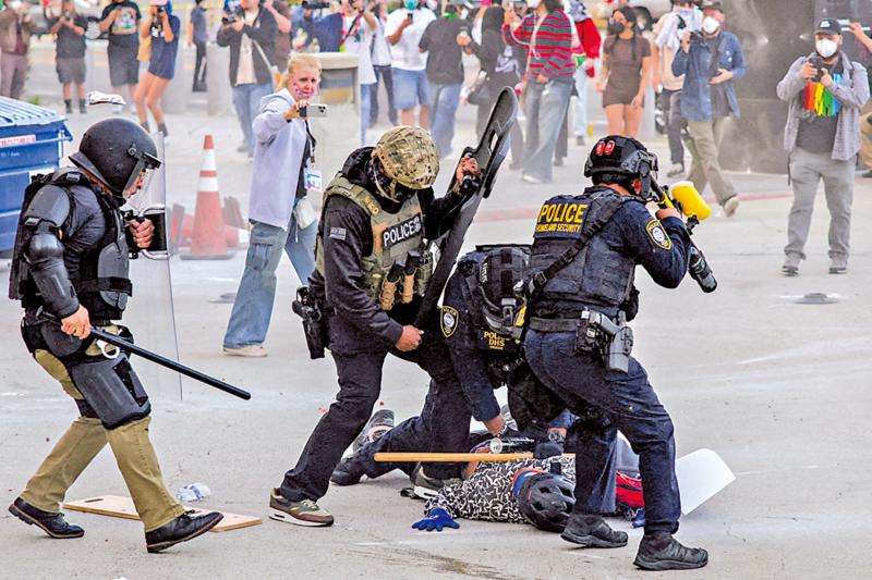 美国这次暴乱,导火线是执法部门针对非法移民进行的强硬执法行动,引发当地严重的警民冲突,大批民众纷纷上街示威,骚乱之火迅速由洛杉矶蔓延至其他城市。一如过往,特朗普随即重手平乱,出动包括移民局、国民警卫队、国土安全部、FBI等机构镇压,各地烽火连天,催泪弹、震撼弹和橡胶子弹在街头横飞,示威者与军警展开肉搏,掷石头、“火魔法”、黑衣人、到处涂鸦,这些港人记忆犹新的画面纷纷在美国上演。所不同的是,与香港警队的克制相比,美国军警一开始就往死里打,不但示威者被打得头破血流,连不少记者也受池鱼之殃,但特朗普半句道歉都没有,更没有成立什么调查委员会,总之大力镇压绝不手软。