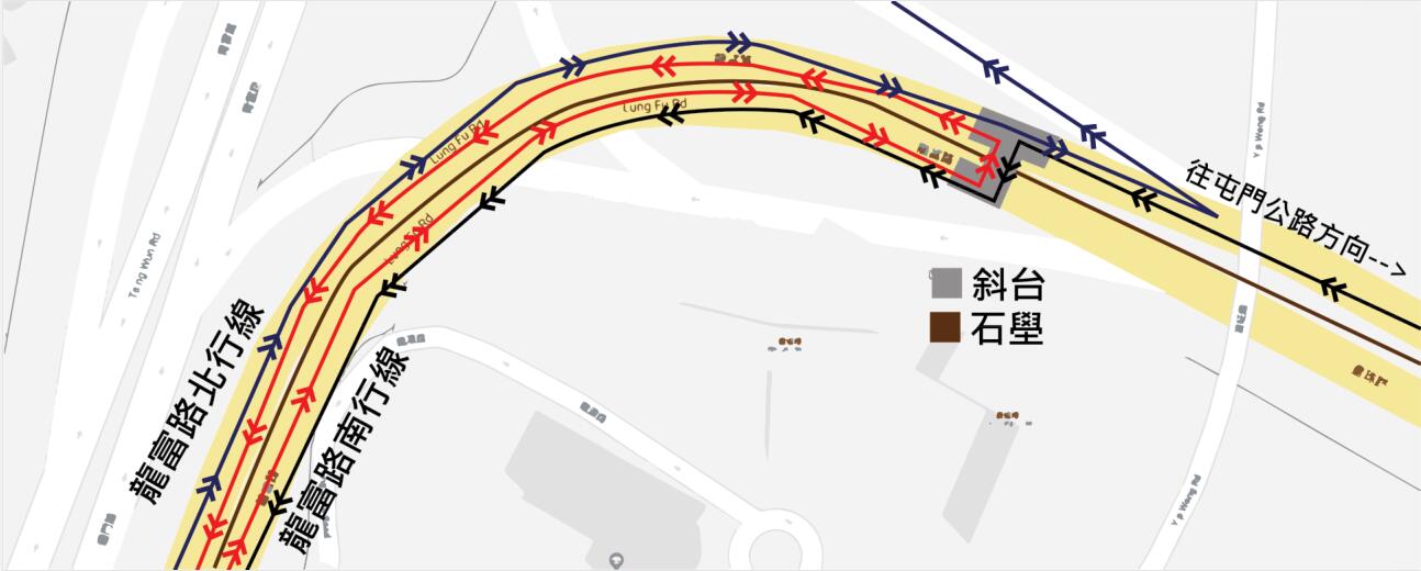 天后路近天后廟(起點) → 業旺路 → 青雲路(南行) → 皇珠路(往屯門公路方向)→屯門公路(往大欖方向) →折返點(1)屯門公路(往元朗公路方向) 近屯興路→ 屯門公路(往元朗公路方向)→ 折返點(2)(屯門公路近順德聯誼總會李金小學)→屯門公路(往元朗公路方向) → 折返點(3) →皇珠路 → 龍富路(往龍鼓灘方向) → 折返點(4)(龍富路近龍門路)→ 龍富路(往龍鼓灘方向) → 折返點(5)(龍富路近皇珠路) → 龍富路(往屯門公路)→ 折返點(6)(龍富路近龍門路) →龍富路(往屯門公路方向)→ 皇珠路→(折返點(7)(近海皇路) →青雲路→ 業旺路 → 天后路近天后廟(終點)