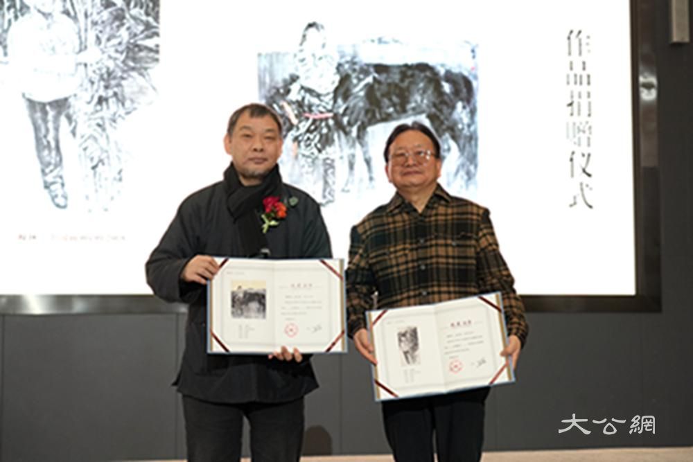 巫卫东向郑州美术馆捐赠作品,罗鸣接受捐赠,并颁发收藏证书。