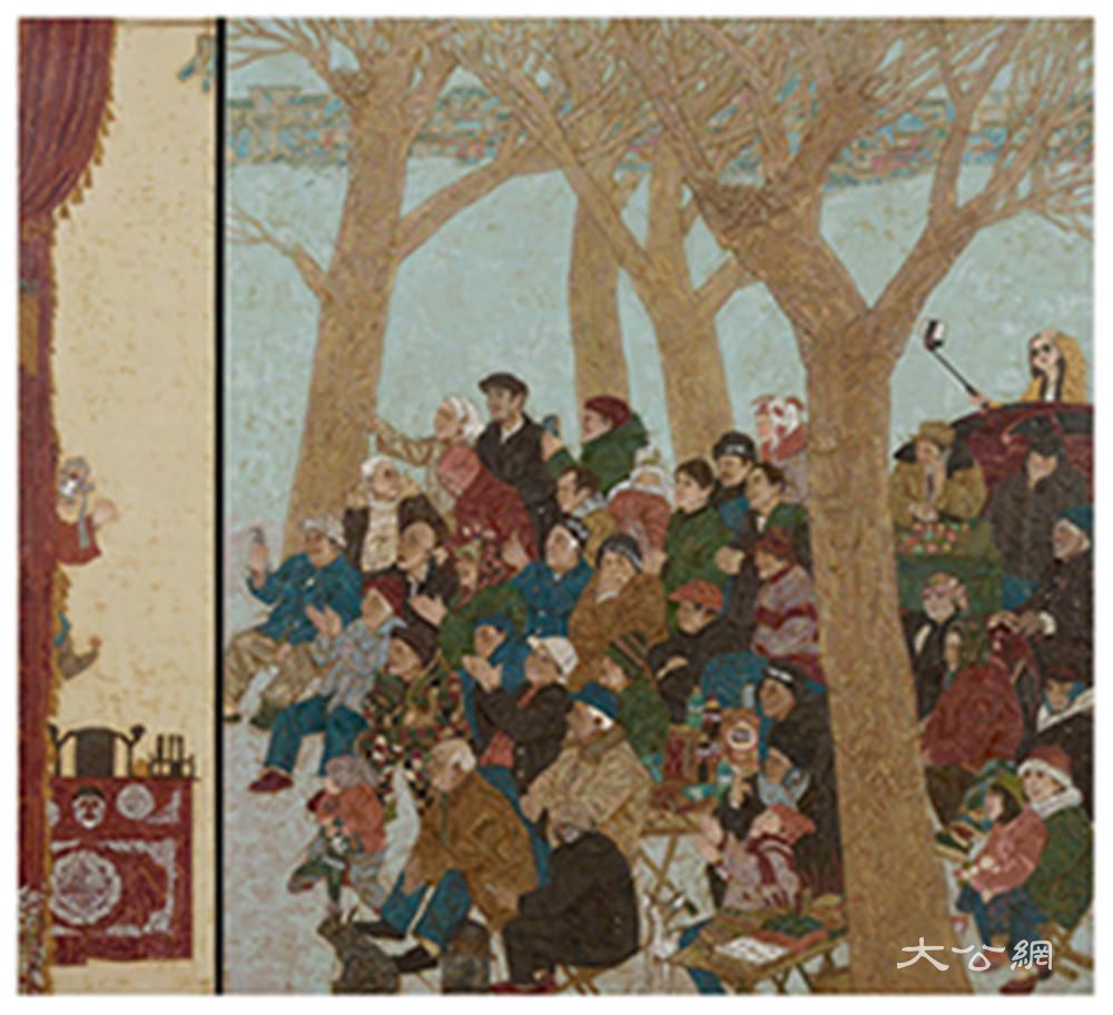 青年画家刘明玉的漆画《乡音笑语》,就是聚焦于春节期间群众观看河南梆子戏的热闹场面,为观众展示出一幅饱满热烈、喜庆喧阗、和谐安康的画卷,每一处细节都充满生活质感。