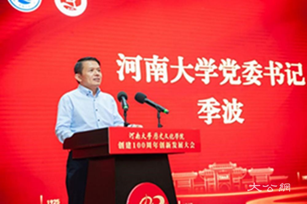 河南大学党委书记季波代表学校对历史文化学院建院一百周年表示热烈祝贺。他指出河南大学正在展现出不可逆转的振兴之势,希望历史文化学院继续坚持党建引领,锚定筑峰学科建设目标,弘扬老一辈学者高尚品德和治学精神,培育更多爱党爱国、本领精湛、可堪大用的栋梁之材。