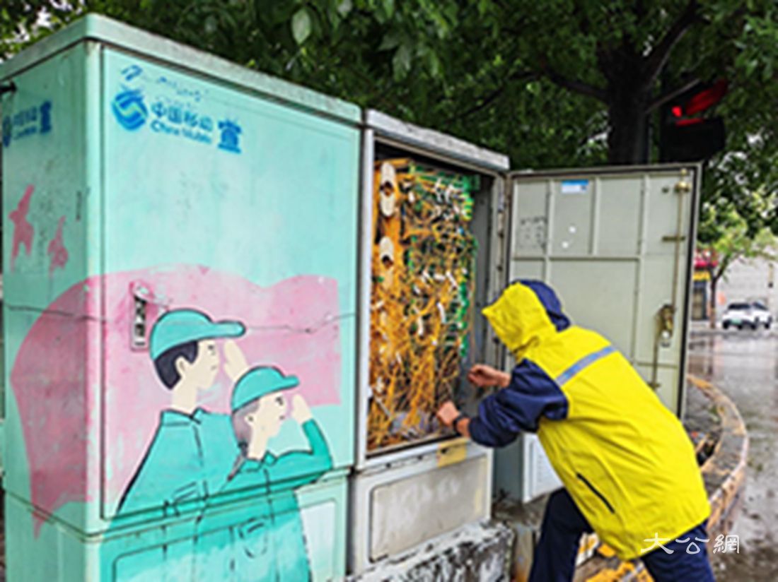 中国移动河南公司新乡分公司保障人员冒雨抢修光交箱现场