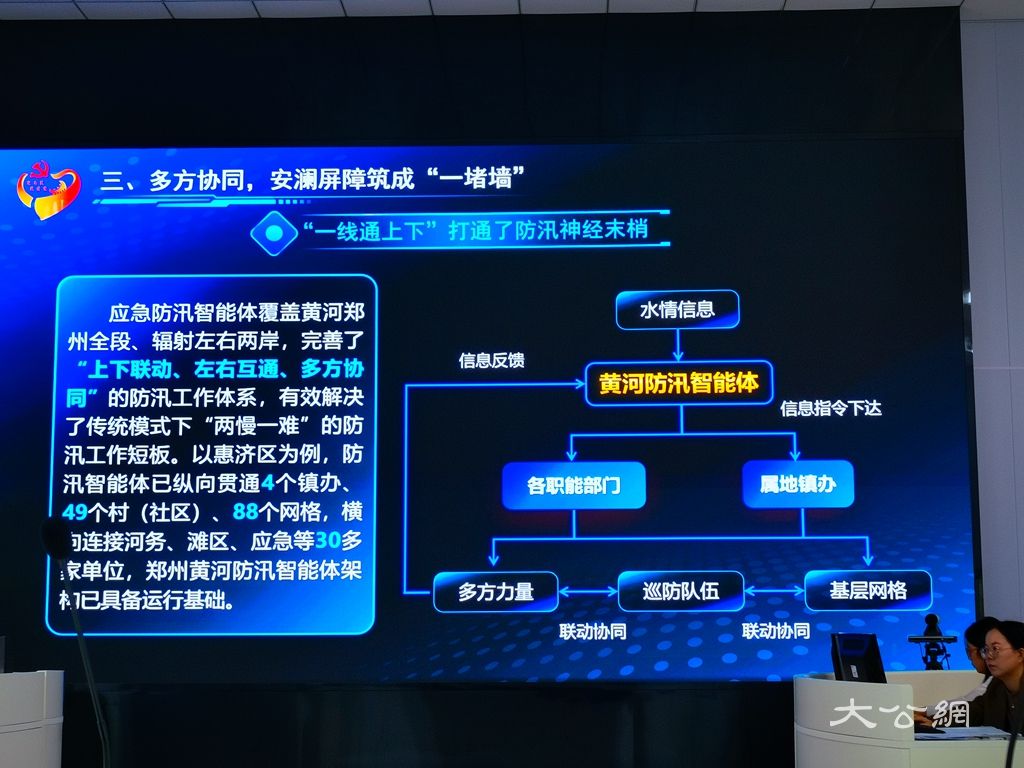 “传统防汛模式下,存在着水情信息传递慢、调度指令传达慢、多方联动同步难的问题。水流量达到一定等级、发布红色预警,只能通过短信电话逐个通知相关单位。” 郑州市惠济区委智慧城市运行办公室副主任张钊说道,“针对这些问题,我们借助数字化技术、依托郑州市日益完善的网格化工作体系,深度融合了属地防汛力量与黄委会专业力量,形成了‘一核统多元’的协同作战体系,构建起“智防+技防+人防”三位一体的黄河防汛智能体。 我们在智能体内植入了300多条防汛指令,会根据黄河水流量数据自动对应防汛等级,形成代办指令列表,精准匹配责任单位和责任人,实现指挥调度一键直达。同时,一线防汛人员还会根据任务指令对防守区域进行巡防巡查,将现场画面等信息,实时回传至系统,为指挥决策提供支撑。另外,通过网格指挥调度体系、数字孪生系统,以及“智能石头”等一系列智能化、信息化技术手段,构建起了黄河汛情预警、指挥、调度、处置全流程闭环管理的新型智慧化、网格化工作模式,牢牢把握防汛主动权,守护黄河安澜。