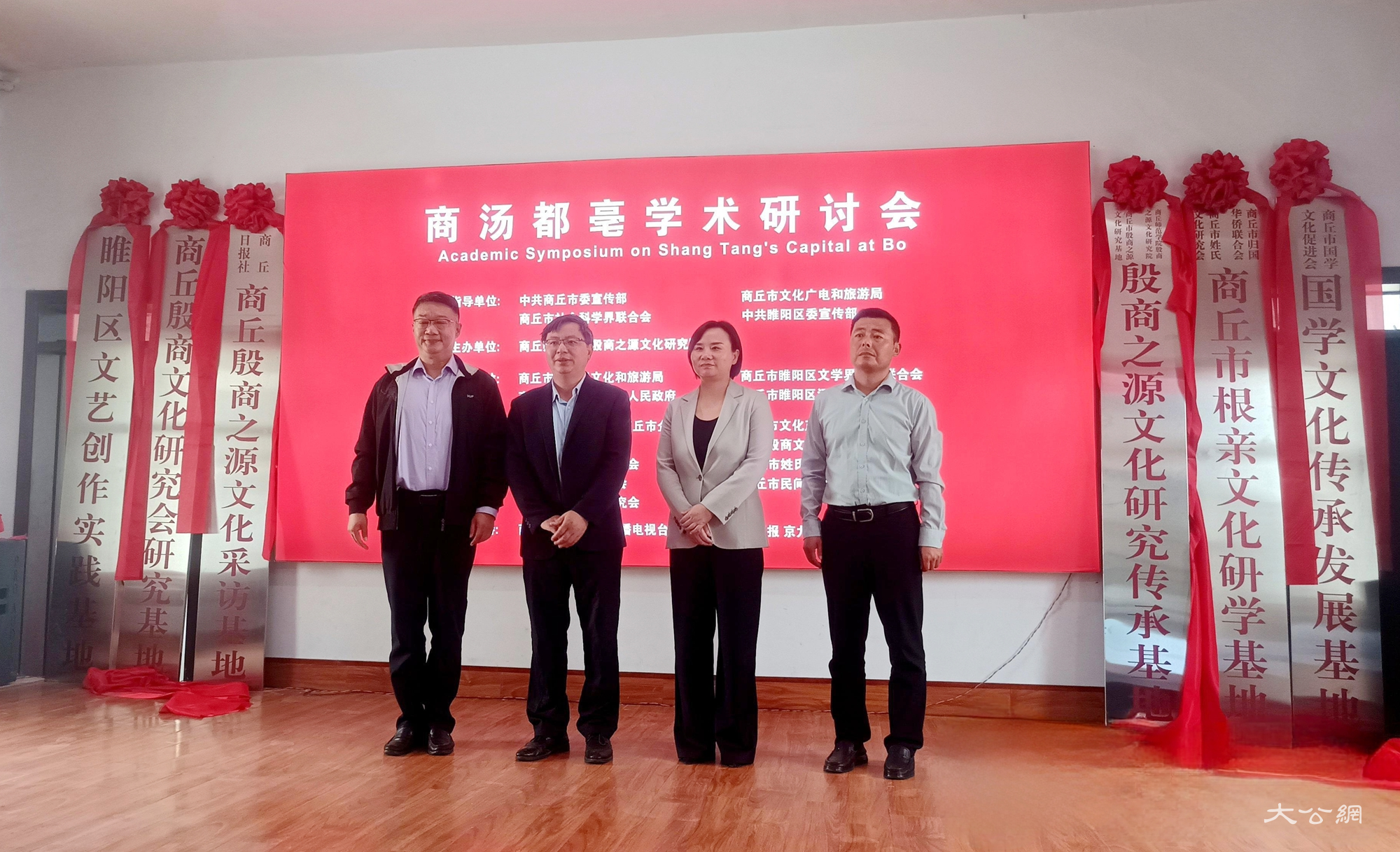 研讨会现场,商丘市殷商之源文化研究传承基地、商丘殷商之源文化采访基地、商丘殷商文化研究会研究基地、商丘市国学文化传承发展基地、商丘市根亲文化研学基地、睢阳区文艺创作实践基地同时揭牌,刘澜涛、陈星、黄英杰、刘亚光共同为以上6个基地揭牌。