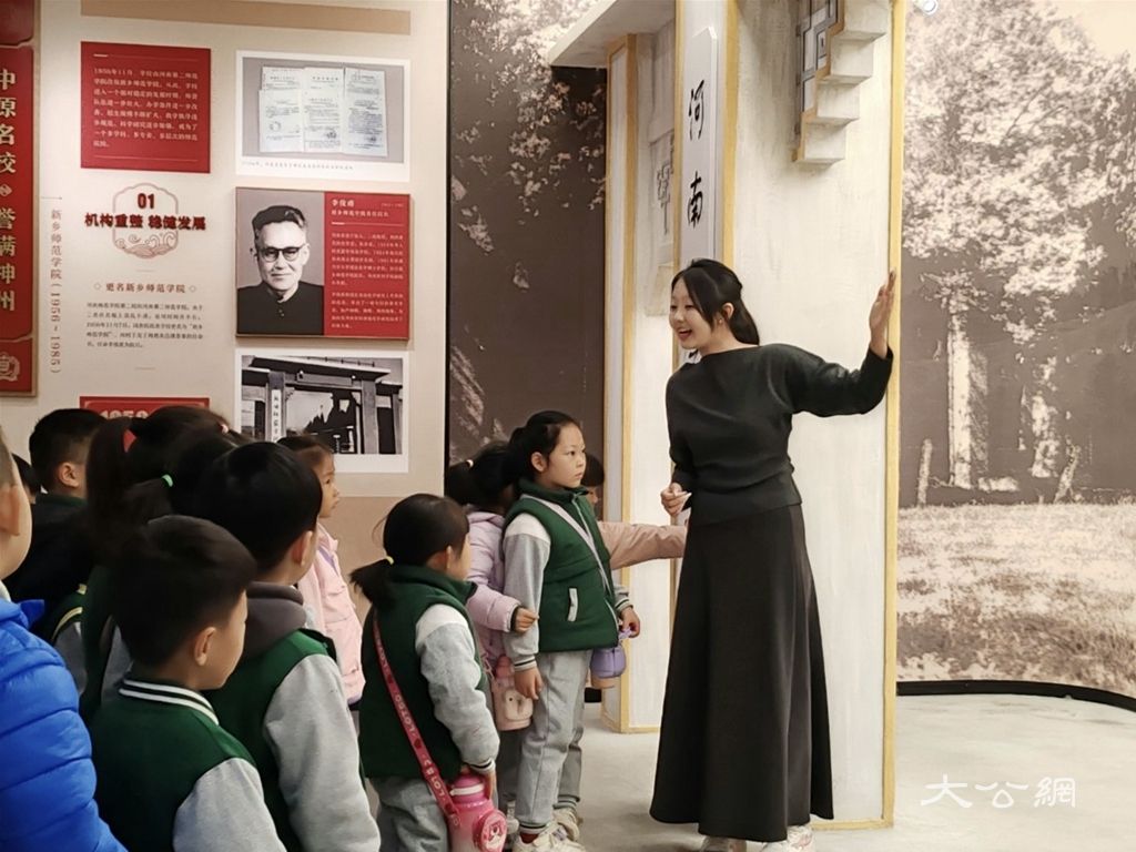 【大公网河南讯】2025年10月21日上午,河南师范大学校史馆里响起了稚嫩的欢笑声,33名平均年龄5岁的河南师范大学幼儿园小朋友,成为这里“史上年纪最小的参观者”。在校史馆讲解员司若涵、童紫英的精心策划与幼儿园老师的全程陪伴下,孩子们用1个半小时的“校史游戏闯关”,与河南师大的百年历史来了一场生动对话。