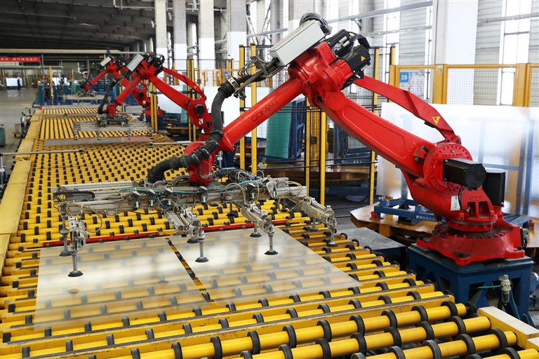 在位于襄城县的许昌安彩新能科技有限公司,工业机器人在生产线上精细作业。 牛书培 摄