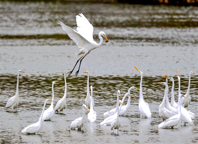 白鹭在贾鲁河中嬉戏,如今的贾鲁河已成为郑州的“水鸟乐园”。本版图片均为河南日报记者 邓放 摄