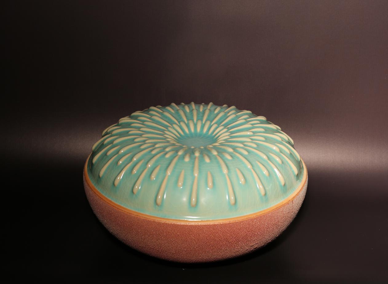 《碧泉叠韵》以层叠结构模拟生态循环,《祥瑞满天》将传统纹饰转化为当代道德象征,《莲心》则通过物理空间的“空”抵达禅宗哲学的“悟”。这种“意匠经营”不是对传统钧瓷美学的背离,而是在当代语境下的创造性转化。作品中,窑变的随机性与艺术家的自觉构思形成张力,恰恰成就了其独特魅力。
