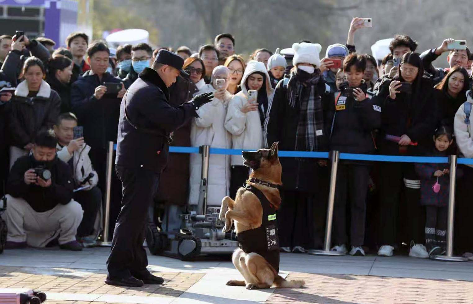 同学们期待的警犬表演环节,随着训导员一声令下,警犬迅速投入工作,在搜爆科目中精准找出隐藏的爆炸物模型;在扑咬服从演示中,警犬对“目标嫌疑人”发起精准扑咬,动作迅猛有力。完成任务后它们又立刻回归温顺状态,灵活的表现让同学们赞不绝口,纷纷与可爱的警犬合影留念。