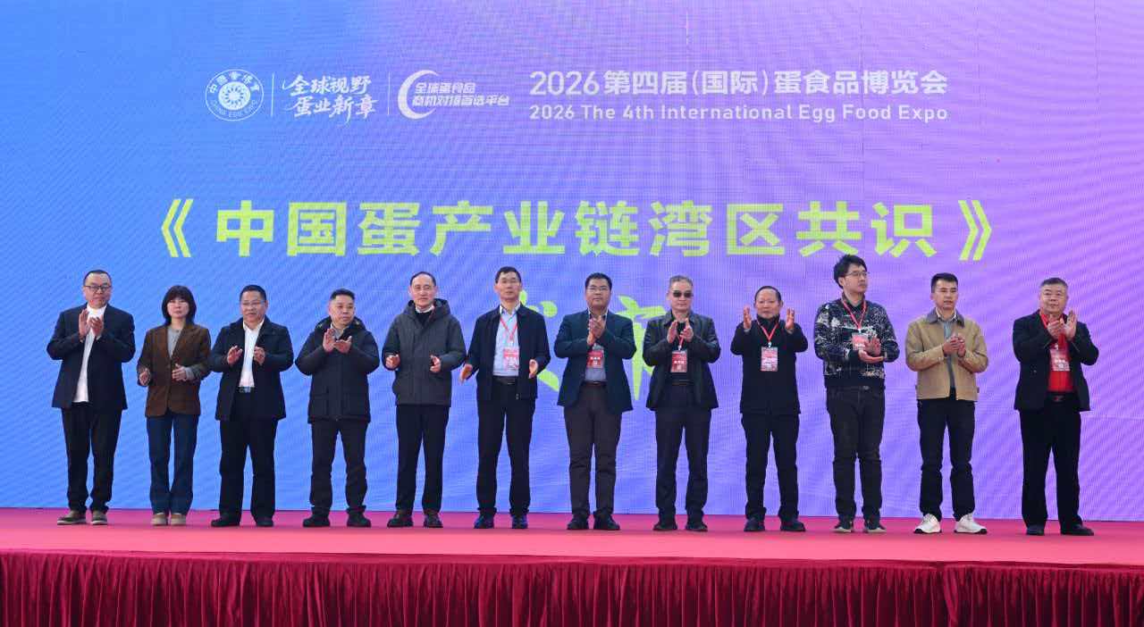 随后,广东省焙烤⻝品糖制品产业协会秘书长 吕品、广东省家禽业协会蛋鸡分会会长 杨伟清、广东省蛋品协会副会长 董平天、湖北家禽业协会会长 李德胜 、上海市蛋品行业协会秘书长 马国贤、重庆市畜牧业协会秘书长 袁昌定、河北省家禽业协会秘书长 赵万青、山东省畜牧业协会禽业分会秘书长 冯楠、贵州省禽业协会会长 何俸科、四川圣迪乐村生态食品股份有限公司总裁 邓兴亮、福建光阳蛋业股份有限公司董事长 余劼、山西晋龙养殖股份有限公司营销总监 张艇,共十二位贵宾共同发布《中国蛋产业链湾区共识》并宣布开幕。
