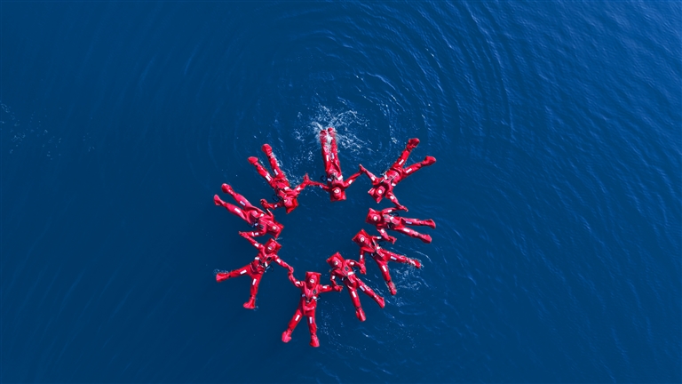 游客身穿专业漂浮装备在云台山子房湖体验冰浮项目。 云台山景区供图