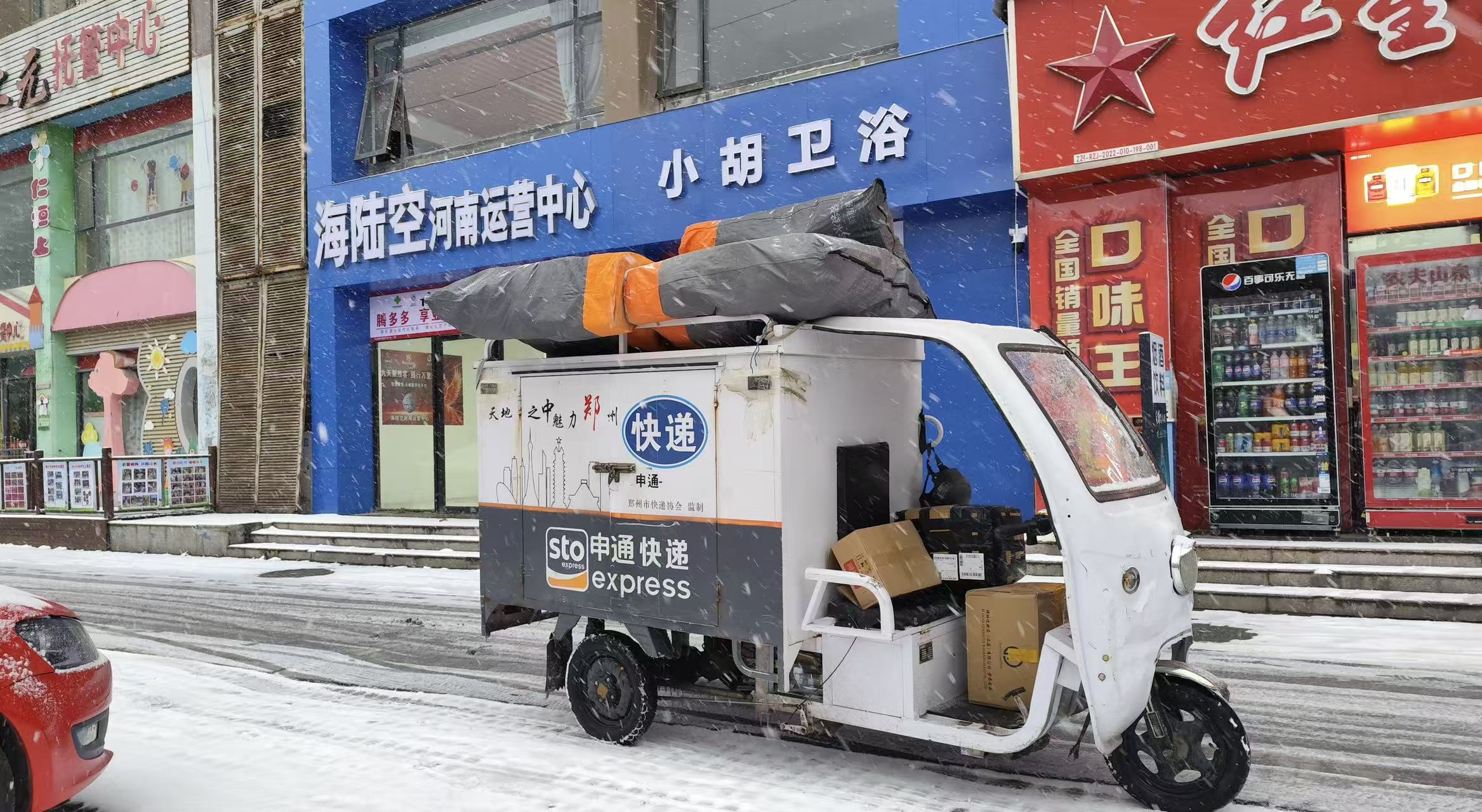 在申通郑州机场网点,快递员张坤甚至自创了“雪地配送法”——用气泡膜包裹易碎件,用防水袋套好文件,重物放在车底。他说:“有些东西不能冻,有些东西不能湿,客户放心交给我们,我们就要多想一步。”
