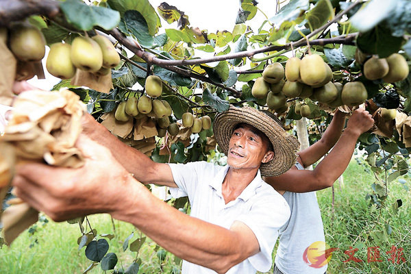 井冈山人凝心聚力,通过发展合股农业、乡村旅游脱贫。图为井冈山市拿山乡沟边村果农王福生在果园管理猕猴桃。/ 数据图片