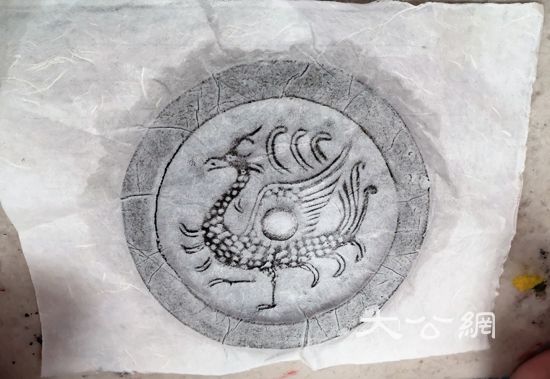 在开封市文化会客厅一楼,有一项传统技艺吸引着八方游客。在展厅内侧,一张长桌上铺着毡布,一位工作人员在操作传统的拓片手艺。这项手艺简单易学,利于上手但同时也考验耐心和细心。所谓拓片,就是指将宣纸覆盖在具有雕刻图案的文物,然后运用粘上颜料的拓包进行按压,在宣纸上把雕刻的图案复制下来的做法。因为其简单上手又可以零距离接触文物,游客们被纷纷吸引前来体验。