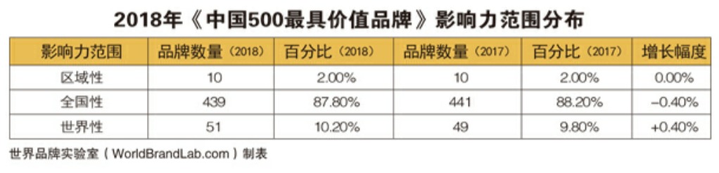 在榜单中,具有全国范围影响力的品牌有439个,占87.80%。具有世界性影响力的品牌数为51个,这一数据比去年有所提高。