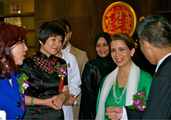 北京同仁堂集团副总经理丁永铃与迪拜健康城自由区管理局主席、阿联酋副总统兼总理夫人哈雅公主在北京同仁堂迪拜店开业仪式上
