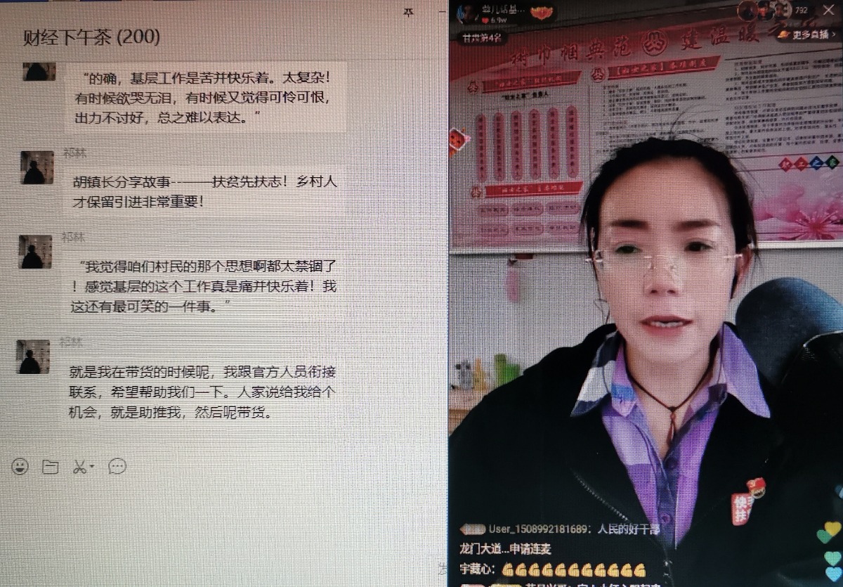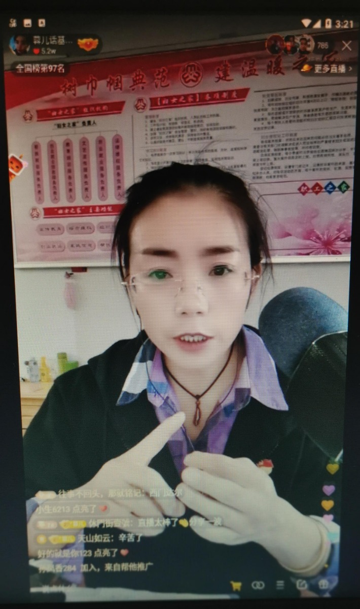 除了直播带货,胡荣还透过直播进行政策宣传。今年初,为配合国家疫情阻击战略,胡荣在直播平台上不断叮嘱村民不外出、不乱跑、宅家里。