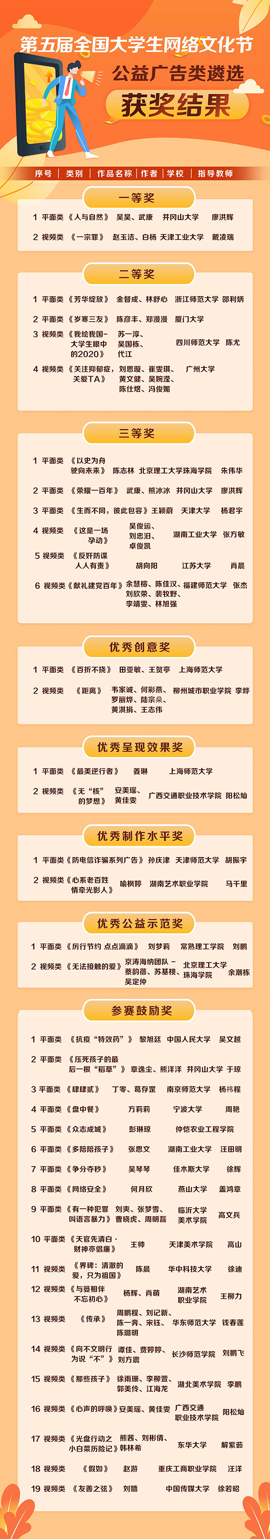(图6:“第五届全国大学生网络文化节公益广告评选”获奖名单)