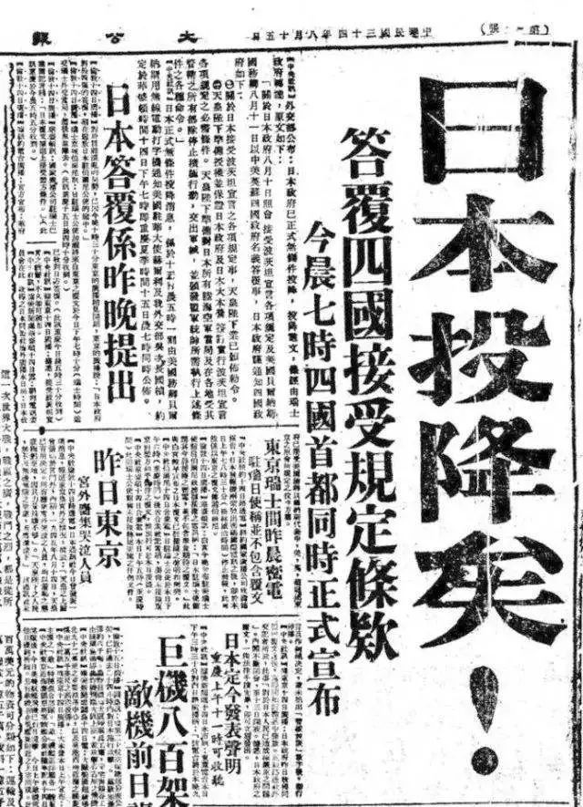 次日,《大公报》总编辑王芸生亲自撰写社论《日本投降了》,开篇引用了杜甫名句“剑外忽传收蓟北,初闻涕泪满衣裳……” 喜极而泣的情形跃然纸上。