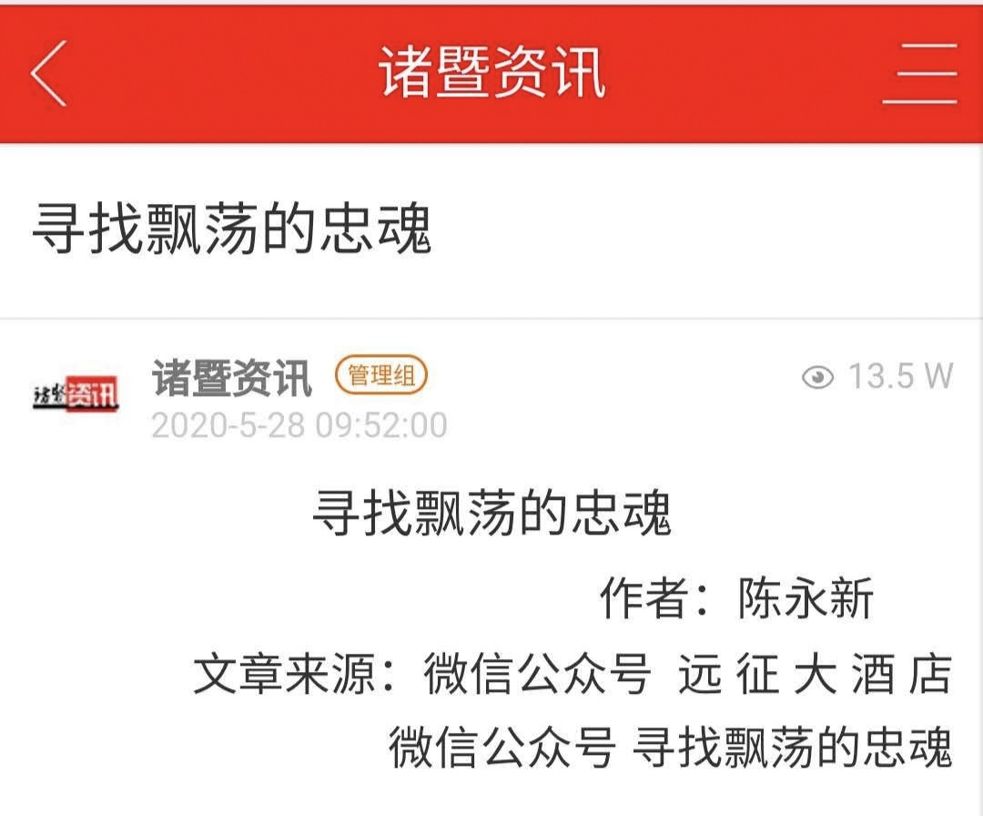 有一次与我们当地一位朋友聊天,他调侃道:此文是墙内开花墙外香,我即开玩笑:那就请当地《诸暨日报》的诸暨在线APP也发一下吧,如果当天不上10万阅读量就算我吹牛。还好,我的牛皮没有吹破,当天就上了10万。而诸暨在线总粉丝仅22万,三天后诸暨在线又发了我的忠魂文《后记》,两篇文章在诸暨本土的阅读量达到了23.7万。